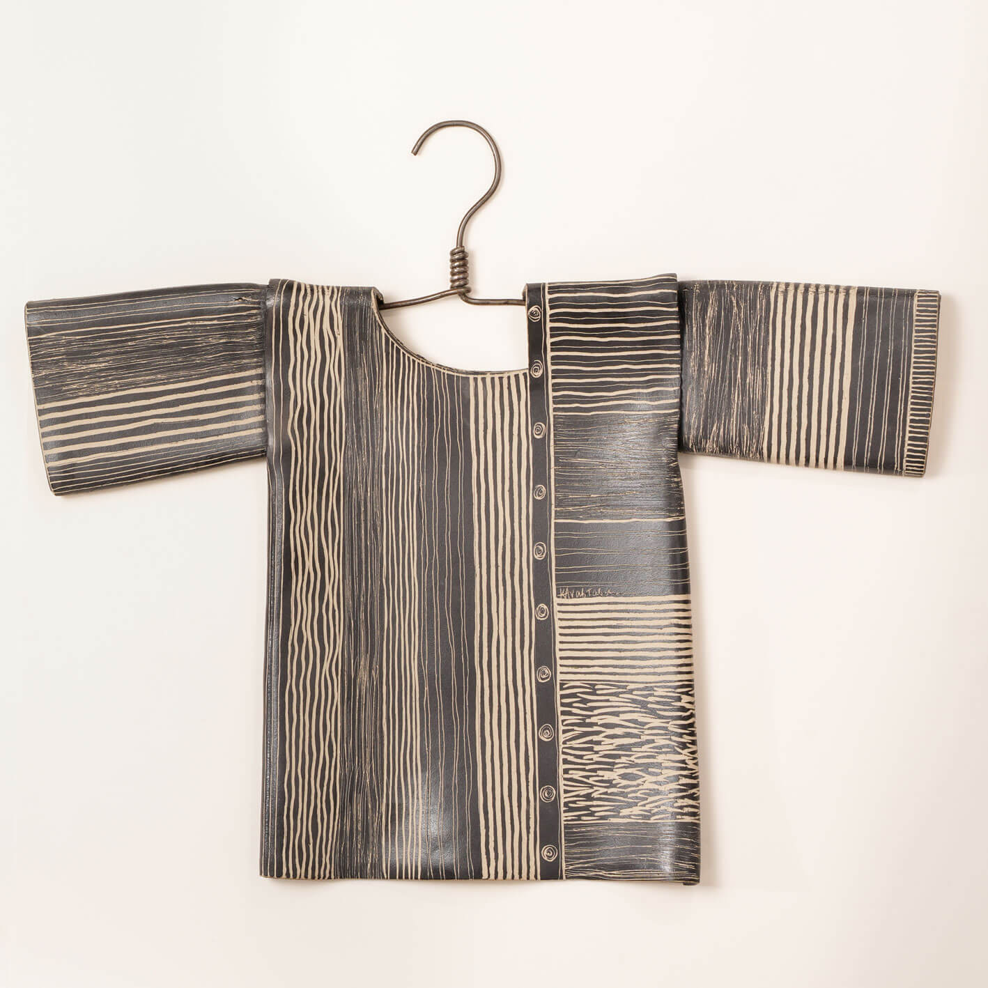 T-Shirt with one-of-a-kind motifs hanging on a hand-made iron coathanger. Unglazed stoneware clay with black engobe engraved via the sgrafitto method. The hanger is placed on the wall with one support point, and the ceramic T-shirt is placed over the hanger.